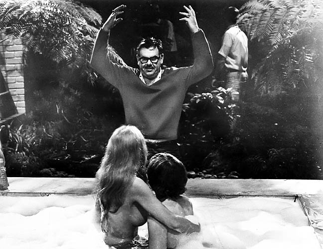 What we’ve not yet got into here is what, exactly, Meyer was filming so exquisitely. And that’s where things become truly fascinating. Meyer seemed to be a man of extreme contradictions – a shameless exploiter who proudly called himself a pornographer (albeit a high class one) yet whose early narrative features took influence from the lofty likes of John Steinbeck and Italian neorealism. A misogynist who nonetheless handed huge amounts of control of his business affairs to his wife, the stunning and formidable Eve, after whom he named his production company – a woman with whom he continued to work and place massive trust in despite his having collapsed the marriage with his constant affairs. A meat-and-potatoes, missionary-position-only Middle American ‘traditionalist’ whose sex scenes included at-the-time taboo-breaking depictions of interracial couplings and adulterous lesbians, up to still-shocking brother-on-sister shower sex and, eventually, Adolf Hitler being penetrated by a hugely endowed whip-wielding man in a dungeon. A domineering man who hired women solely for their physical attributes and put them through hell on set, while also creating fascinating and powerful roles for them, and toward whom many of his actresses held extremely fond feelings for the rest of his life. His plots are sex-drenched, yet far from wall-to-wall filthy, often possessed of a weird innocence among all the bared flesh but prone at any moment to break into a scene of distasteful sexual violence against women that is frequently handled with shocking insensitivity. And then, sometimes even in successive scenes within the same film, Meyer’s beautiful stars are most often portrayed as imperious, statuesque icons, able to destroy any pathetic man in their path with the most devastatingly acidic assessment of their lack of sexual prowess. His filmography ran the gamut from candy coloured go-go dancing frivolity to bleak and brutal freak show gothic to Chuck Jones-ish madcap Pop Art slapstick violent sexcapades, yet managed to retain an unmistakable watermark that was entirely his own.