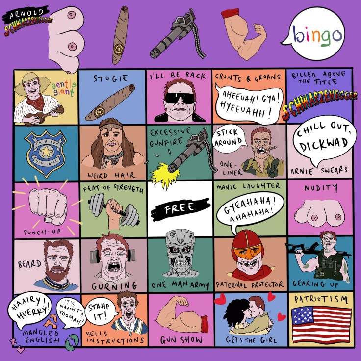 PS I’m always looking for an excuse to wheel out the ol’ Schwarzenegger bingo board, so have fun drinkin’ along, or if you’re a health nut, just do some stomach crunches or sit-ups or something every time an Arnie trope box is ticked. A bingo Trope-Tote™ dedicated entirely to “The Austrian Oak,” “The Running Man,” “Conan the Governor,” “The Governator,” “Schwarzy,” “Arnie” himself – Mr Arnold Alois Schwarzenegger is available to purchase from our sustainable brand buddies at Teemill.