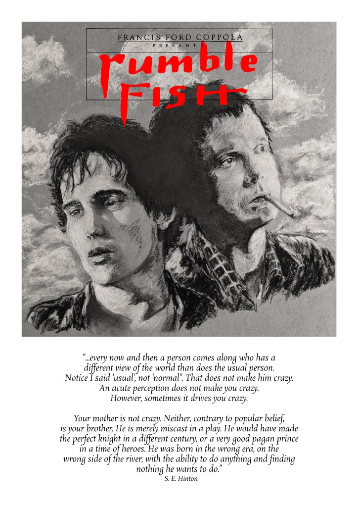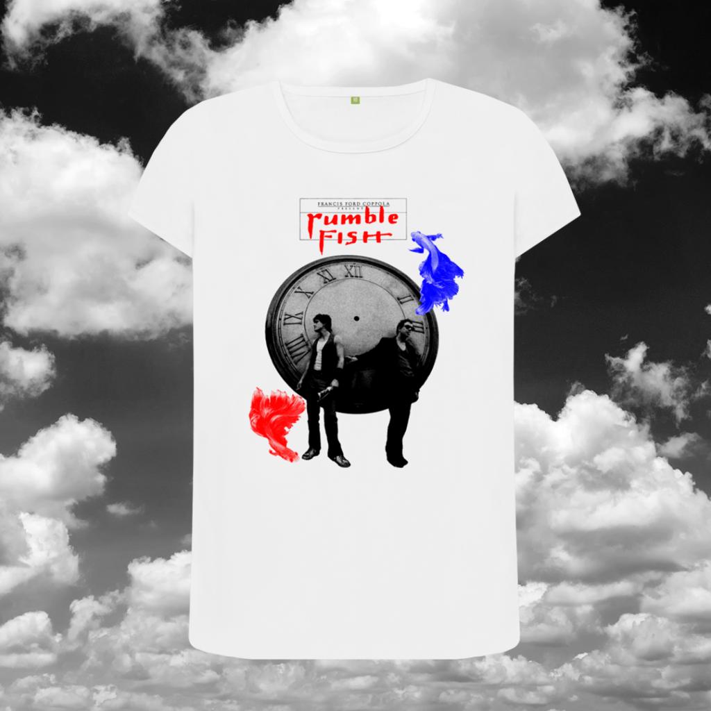 If you go across and check out the wonderful introductory graphics Matt created for our About section on this site, you’ll see that nestled in my alphabetically-assembled Top 10 Films list is this week’s pick – Francis Ford Coppola’s 1983 teen dream Rumble Fish. That it took me 5 years to bring it to the team is the main surprise, as I’ve long been an evangelical admirer of it, surely boring Gali, Patrick and Matt many times over the years by droning on about my love of this odd little monochrome adolescent gang picture. Once I started dabbling in poster and shirt design, it was one of the very first films I decided to create an image for (SHAMLESS PLUG INCOMING – you can find giclee posters for this design on my Etsy store, and standard prints and shirts over at Teemill) as it has rarely been far from my thoughts.