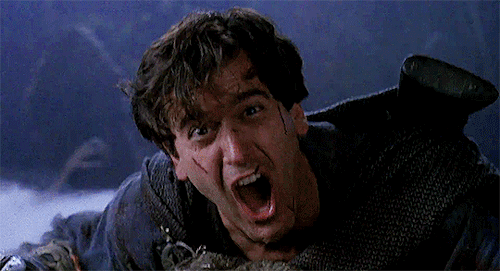 Earmuffs, “Ringers,” but the final flurry castle raid is arguably better than the battle for Helm’s Deep, and for my money, any Game of Thrones episode. Does The Two Towers have a squadron of talking crossbow skeletons? Nope. Does GoT have a ginger-bearded, bony bagpipe band with a femur flute soloist? Don’t think so. I easily get battle fatigue during these kinds of lengthy clashes, but the theatrical cut of Army pitches it just about right. Elements of a personal fave, 1991’s Robin Hood: Prince of Thieves also leapt out, including throwing the ladder down, Ash cutting the rope and flying up the castle side, and impaling an attacking witch with a spear using her own momentum to skewer her.