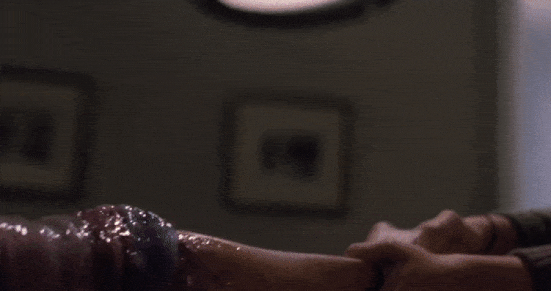 This pick comes with caveats—the score is cacophonous and a bit maddening with its naff, intermittent keyboard stings—honestly, there’s a fraction too much snarling and gurgling in dimly lit hallways, but perfectly executed camera moves like the 90° rotation during the mortuary make out between Judy and Jay, the 360° Angela and Stooge smooch, plus the harsh barbed wire wall climb, which is cringily visceral, and in contrast to the bloody theatrics of what has come before, actually gets under your skin. The motion control, double exposure-showcasing title sequence is also certainly a visual highlight, but it’s unquestionably Angela’s provocatively-possessed, cheeky full moon-flashing, “Stigmata Martyr” spinning and twirling fireside waltz that really takes the cake. Her Cleo Rocos-esque, bendy grind n’ crawl, and strobed strut in fingerless gloves—arched almost supernaturally in black lingerie, marks Night of the Demons‘ second exposed derrière, and much like movies such as Vamp, or From Dusk Till Dawn, it’s a strategically-placed, seductive segue, which serves to transition audiences into the gory second half of the picture.